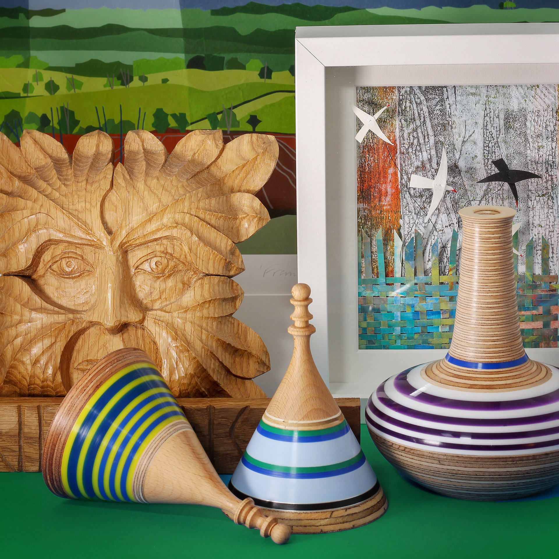 Jewellry by Kate Wilkinson, ceramics by Susan Day and Chris Inder, woodcarving by Steve Keene, turned bowls and paper sculpture by Graham Lester